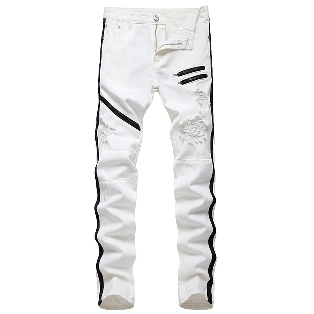 Mens Elastic Large White Zippered Denim Pants